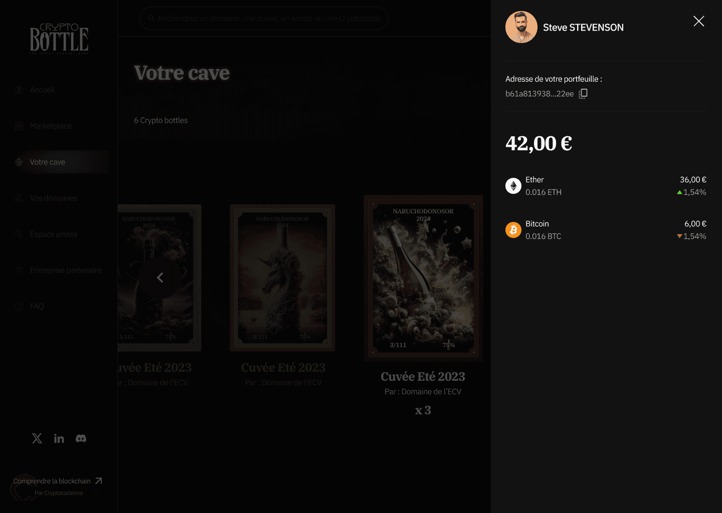 "Cryptobottle est un condensé de ce qui se fait de mieux dans le WEB3. C'est l'alliance des cryptomonnaies, des NFTS, de l'art et d'avantages exclusifs en un seul contenant. Tout simplement magique et inédit ! Créer, déguster, holder et partager les cuvées à venir !!! A la vôtre 👉🍷👈"